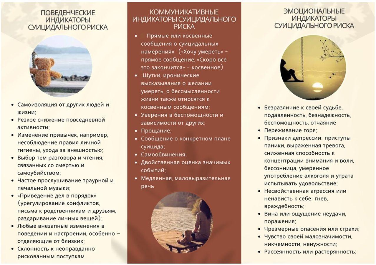 - Высказывания о нежелании жить: «Было бы лучше умереть», «Не хочу больше жить», «Я больше не буду ни для кого проблемой», «Тебе больше не придётся обо мне волноваться», «Мне нельзя помочь».