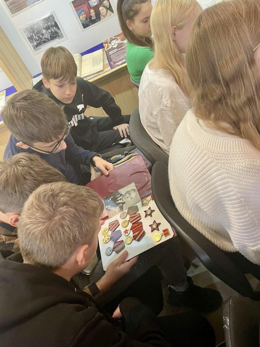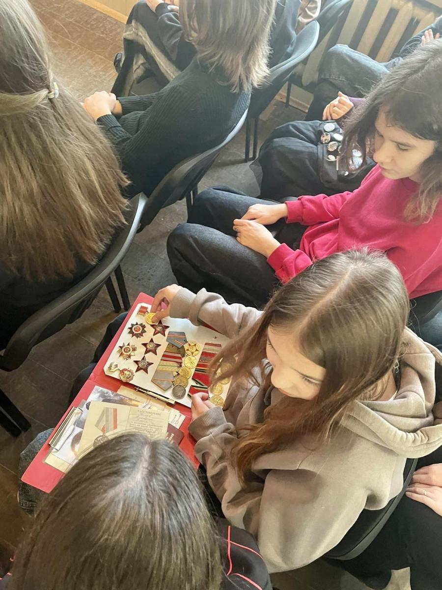Демонстрация орденов и медалей времён Великой Отечественной войны не оставила учащихся школы равнодушными. Дети увлечённо изучали документы, фотографии и боевые награды из семейного архива Владимира Клавдиевича.
