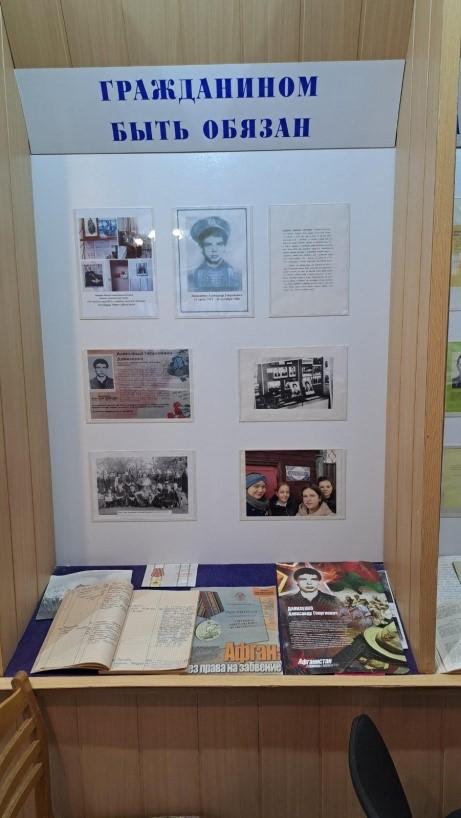 На экспозиции предоставлен материал об учениках школы, которым впоследствии жизнь предоставила возможность проявить гражданскую позицию, служа и защищая Родину. Это: Козовой, Михайлов, Даниленко, Пименов, Бизунов и др.