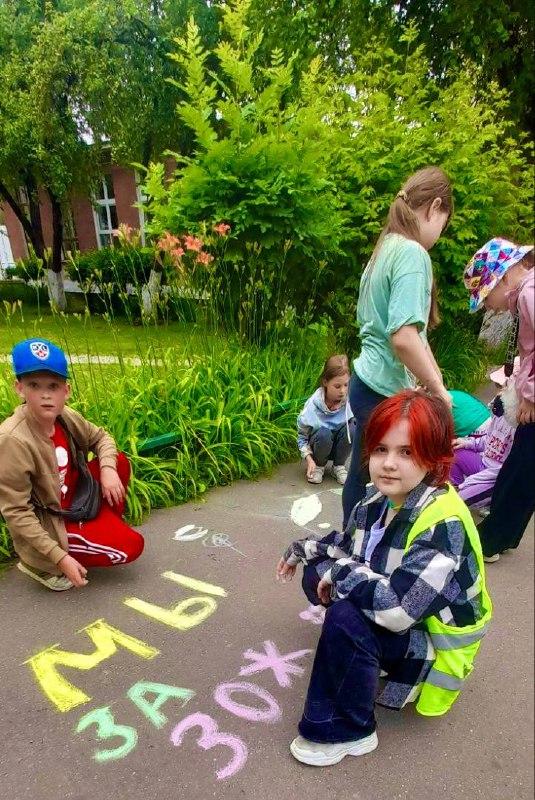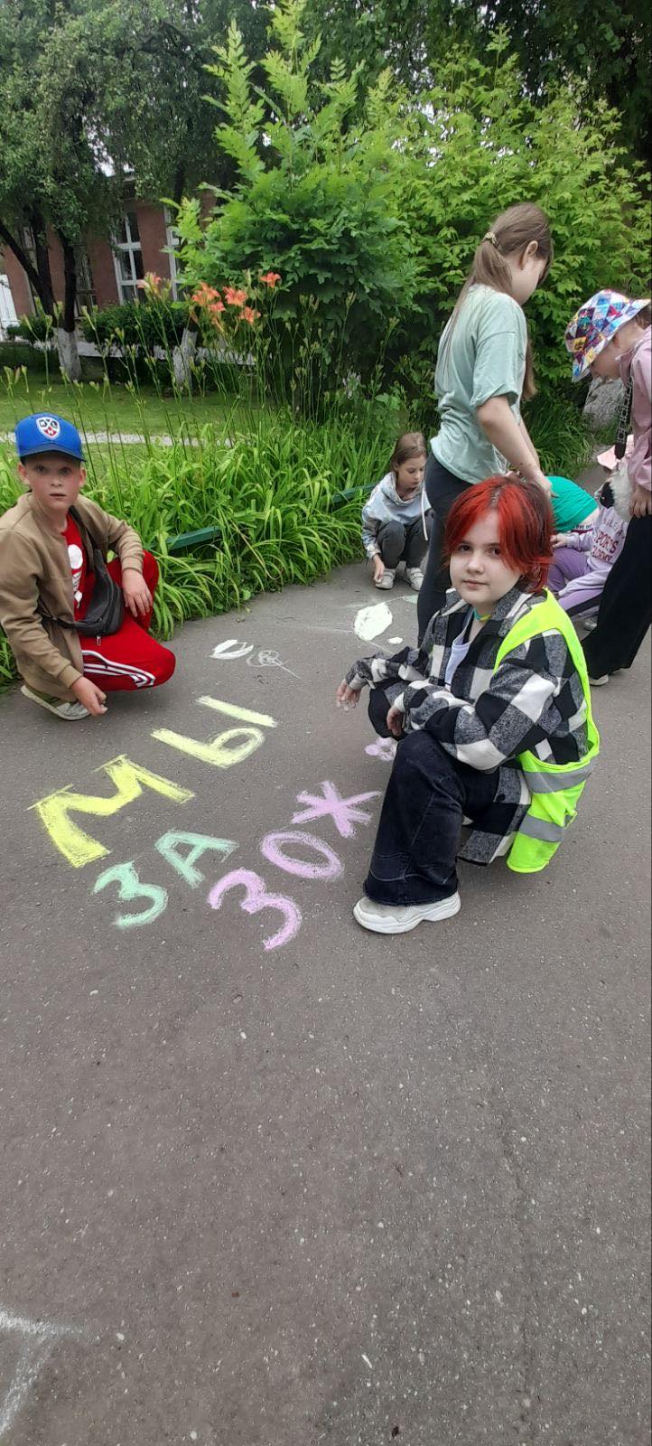 В лагере «Радужная планета» прошёл яркий флешмоб — коллективное рисование на асфальте «Мы любим ЗОЖ»!